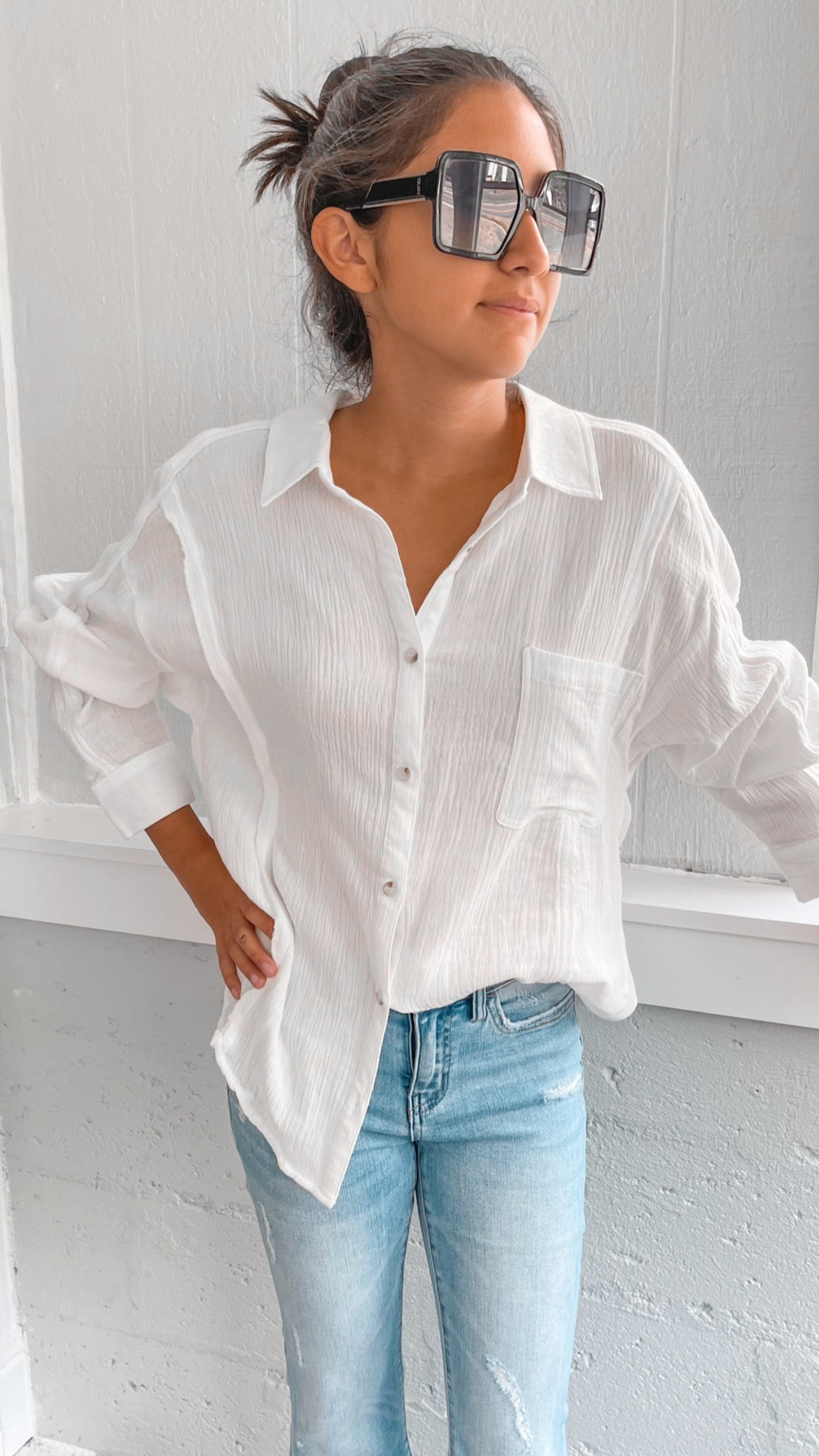 Our Take Me Anywhere Button Up Shirt is crafted from a soft and breathable lightweight white gauze fabric. The loose fit and classic button up style make it perfect for any occasion. Stay comfortable and stylish wherever you go. This is one piece your wardrobe needs. Dress it up with jeans and heels or dress it down with denim shorts and your favorite sneakers or sandals.